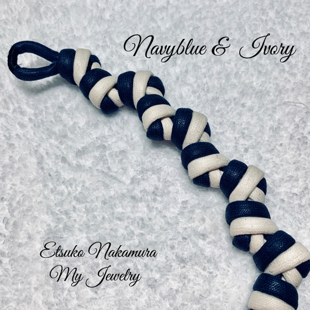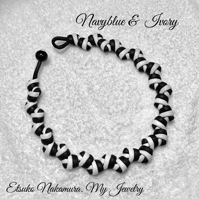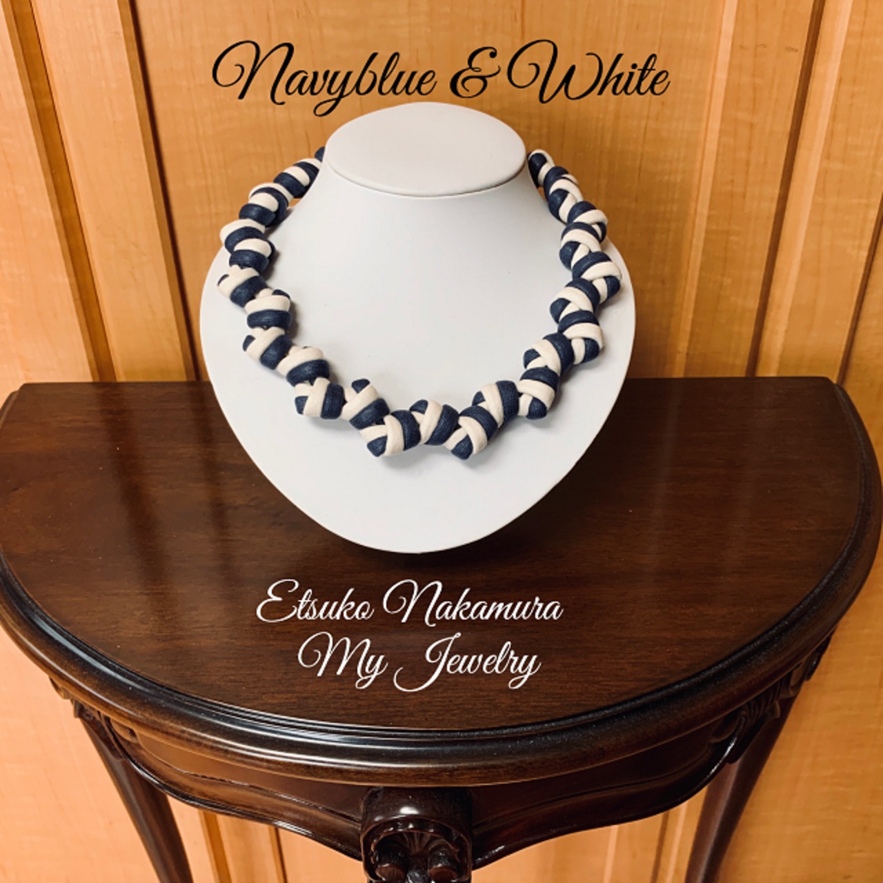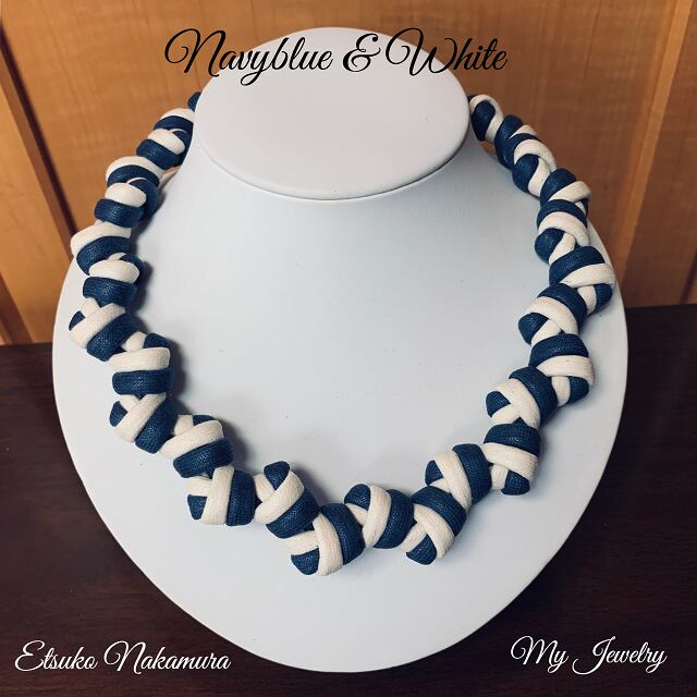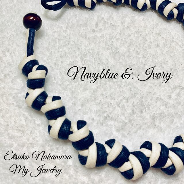 ネイビーブルーとアイボリーの二本取りの、さわやかスッキリなマクラメ編みネックチョーカーです。