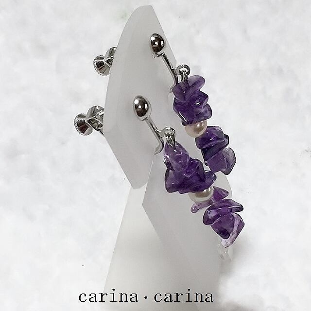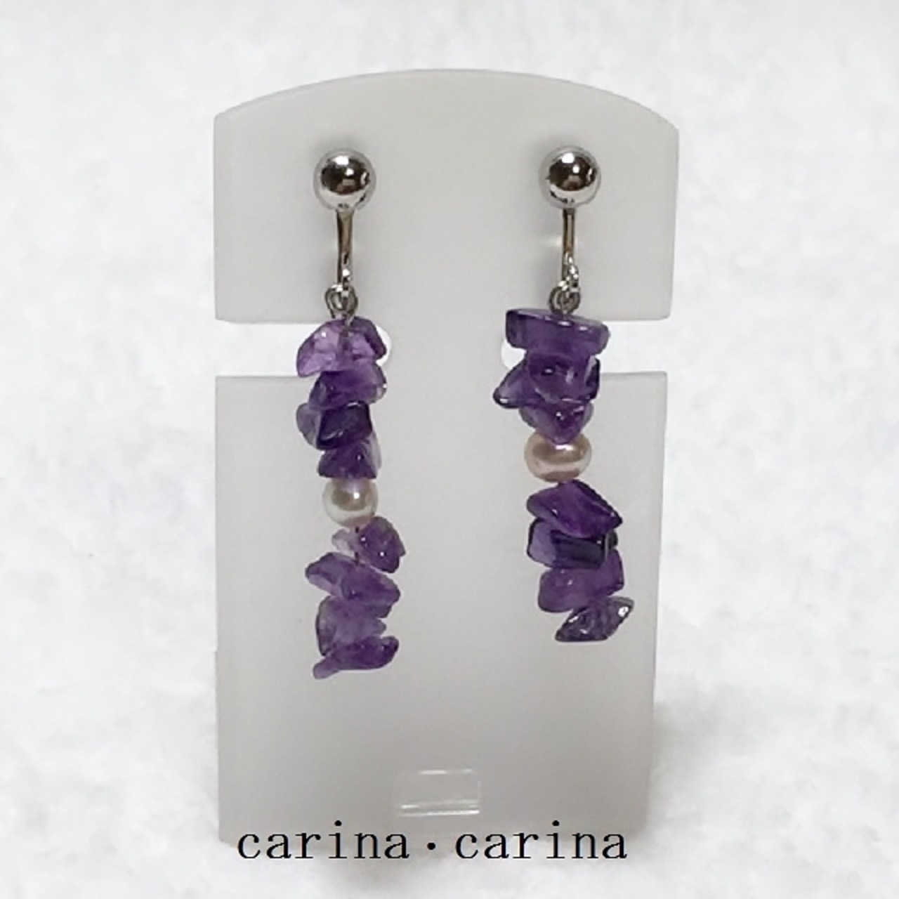色の良いアメシストの紫と淡水パールの薄いピンクが、モダンでもあり優しい雰囲気にもなり、質の良い天然石のイヤリングとなりました。