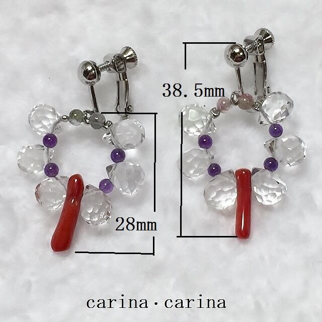 染細枝珊瑚をアクセントに、しずく形で多面的に、カットされキラキラした水晶を、お花のようにぐるっと取り巻き、その間に小粒のトルマリンとアメシストを配置しています。