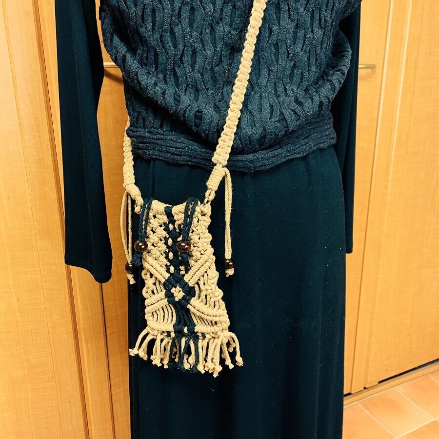 緻密な手編みのマクラメ編みが美しい、スマホを持ち歩くためのスタイリッシュなポシェットです。