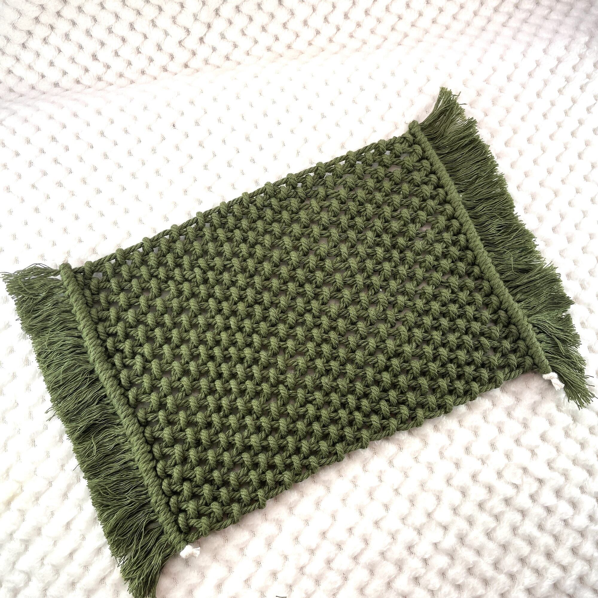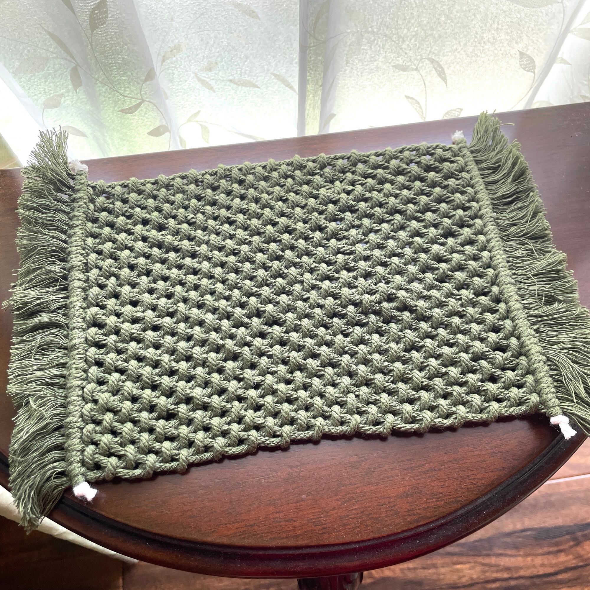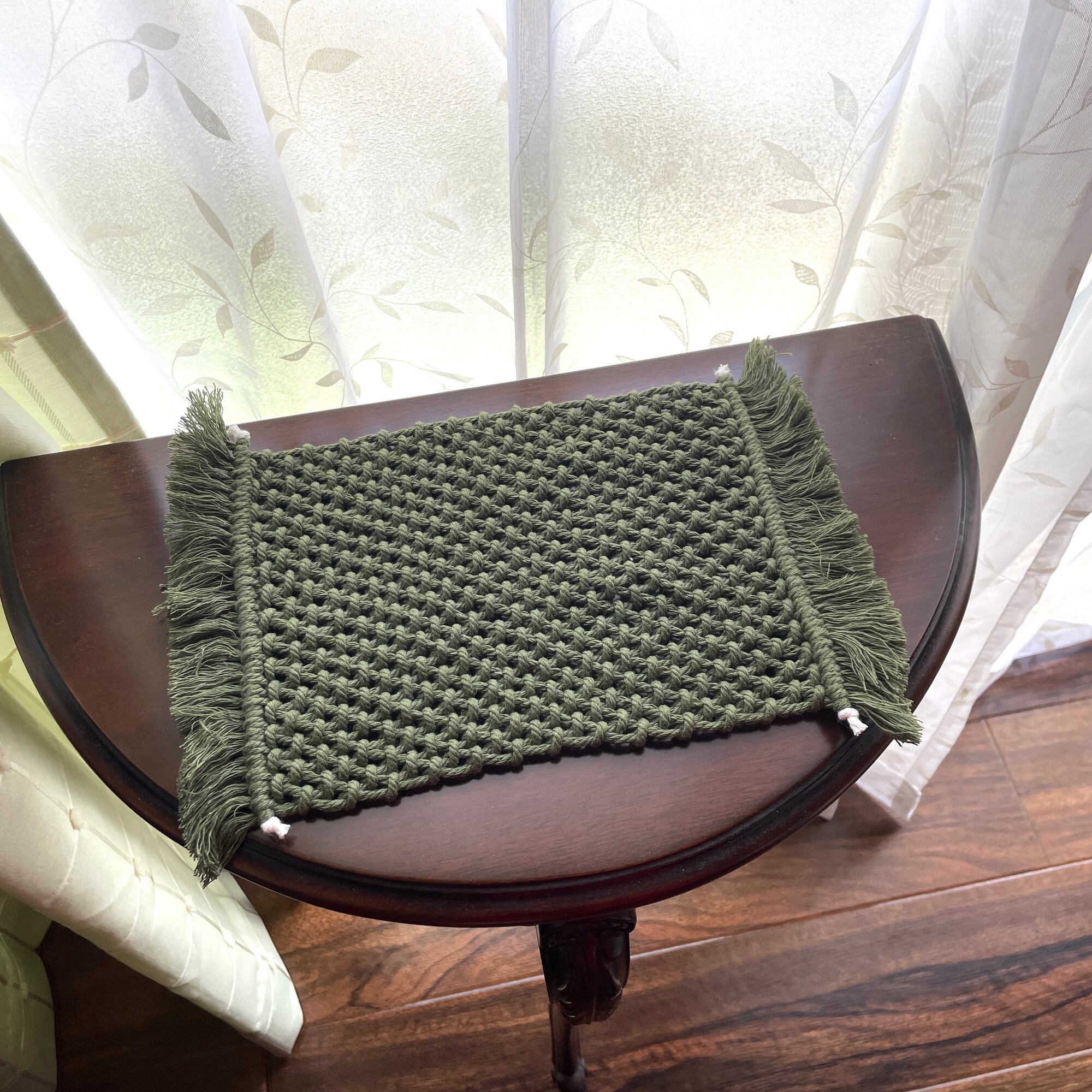 エツコナカムラのマクラメ編みとめ結びのテーブルセンターダークグリーンです。